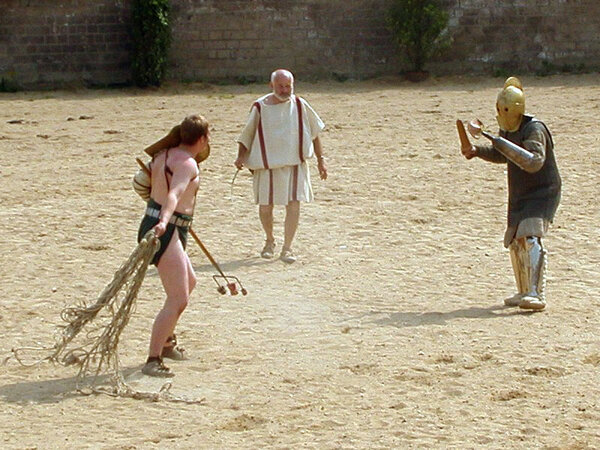 Gladiatoren waren meistens Sklaven oder verurteilte Verbrecher. Oft verpflichteten sich aber auch abenteuerlustige junge Römer, die hofften, so zu Geld und Ruhm zu kommen. Durch einen Sieg und mit der Gunst des Publikums konnten sich manche von ihnen freikaufen. Zeigte der Daumen der Zuschauer und schließlich der des Kaisers nach oben, kam der Gladiator frei, zeigte der Daumen nach unten, wurde er getötet. Das zumindest nimmt man an.