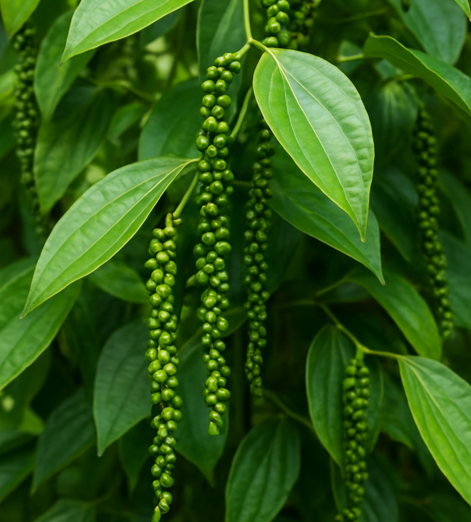 Pfeffer wächst an einer Kletterpflanze, dem Pfefferstrauch. Die Pflanze hat lange, biegsame Ranken, die sich an Bäumen oder Holzstangen hochwinden. An den Ranken wachsen kleine Blüten, aus denen sich dicht stehende Pfefferbeeren bilden.