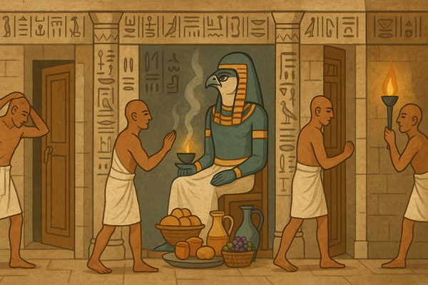 Dann öffneten sie das Allerheiligste, also den innersten Raum des Tempels, in dem die Statue des Gottes stand. Nur wenige Priester durften diesen Raum betreten. Dort führten sie das wichtigste Ritual durch: das Erwachen der Gottheit.