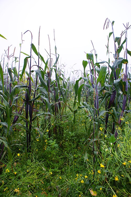 Auf dem Land wurden die Nahrungsmittel produziert. Vor allem Mais, Bohnen und Kürbis angebaut. Das Gemüse wurde gemeinsam in Mischkultur angebaut. Das nennt man auch Milpa. Die Felder entstanden durch Brandrodung. Alles, was dort vorher wuchs, wurde also abgebrannt. Die zurückbleibende Asche diente als Dünger. Dann baute man meist diese drei Pflanzen zusammen an. Dabei dient der Mais den Bohnen als Rankhilfe, die Bohnen liefern Stickstoff und die großen Kürbisblätter schützen den Boden vor dem Austrocknen.