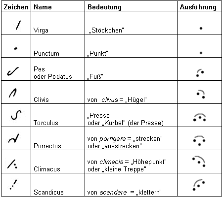 Um sich die Melodien besser merken zu können, suchte man nach einer Gedächtnisstütze. So entstanden die Neumen. Neumen sind Zeichen über dem Text, die aus Strichen, Punkten und kleinen Kurven bestehen. Sie zeigen, ob die Melodie nach oben oder unten geht – also die Richtung des Gesangs, aber noch nicht die genauen Töne.