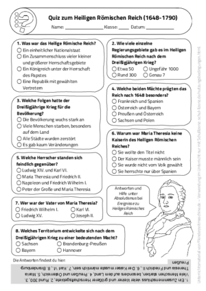 Ein besonders mächtiger Staat in dieser Zeit war Preußen. Dort herrschten Könige wie Friedrich Wilhelm I. und Friedrich der Große. Sie bauten ein starkes Heer auf, sorgten für Ordnung und bestimmten fast alles allein – typisch für den Absolutismus. Preußen wurde dadurch ein Vorbild für viele andere Staaten im Reich. Dazu erfährst du ganz viel auf der Kinderzeitmaschine unter Ereignisse oder auch unter Lucys Wissensbox. Wenn du dein Wissen testen möchtest, kannst du die Arbeitsblätter durcharbeiten und einfach mal dein Wissen testen.