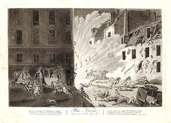 In der Rue Saint-Nicaise versperrte ein Karren den Weg. Napoleons Kutscher raste daran vorbei. Kurz darauf explodierte dieser Karren in einem riesigen Feuerball. Es gab Tote und Verletzte, mehr als 40 Häuser stürzten ein.